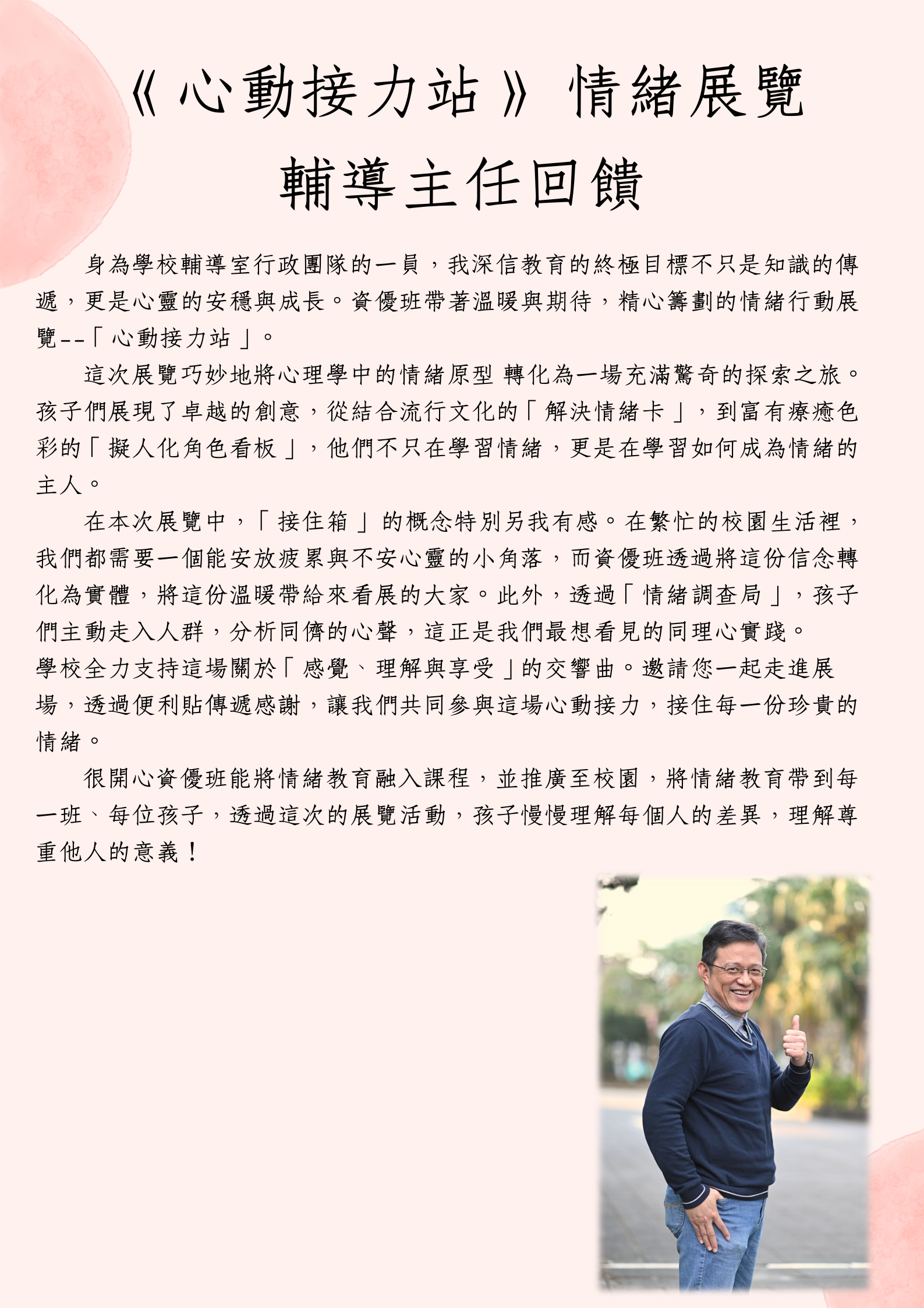 看著孩子們為了這次展覽主動、合作並一起忙碌地定位角色看板、布置現場 ,心裡充滿了欣慰。儘管孩子只有三年級,沒有華麗的辭藻、沒有強壯的力量,但那股願意把尊重他人的心推廣至校園讓大家看見,便已經展現出超群、溫柔與接住他人的力量!